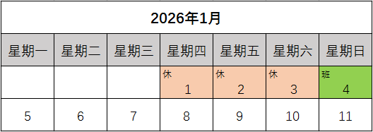 1月1日(星期四)至1月3日(星期六)放假,共3天,1月4日(星期日)上班。